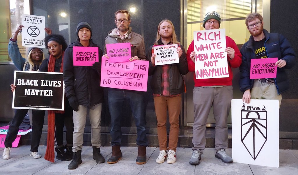 RICHMOND, Nov. 12 — Braving chilly weather, scores of people gathered this evening on the steps of Richmond City Hall to show their opposition to the so-called Navy Hill project, a massive downtown development scheme headed by Dominion Energy Chairman, President and CEO Thomas F. Farrell II.