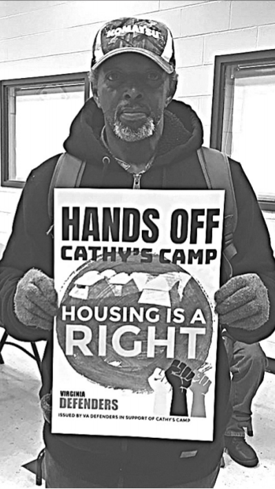 A resident of Cathy’s Camp holds a sign at City Councilwoman Ellen Robertson’s Feb. 5 meeting on homelessness in Richmond.