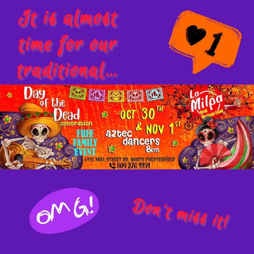La Milpa is hosting the traditional Dia de los Muertos (Day of the Dead) event Oct. 30 and Nov. 1 outside its restaurant and market at 6925 Hull Street Road, North Chesterfield.