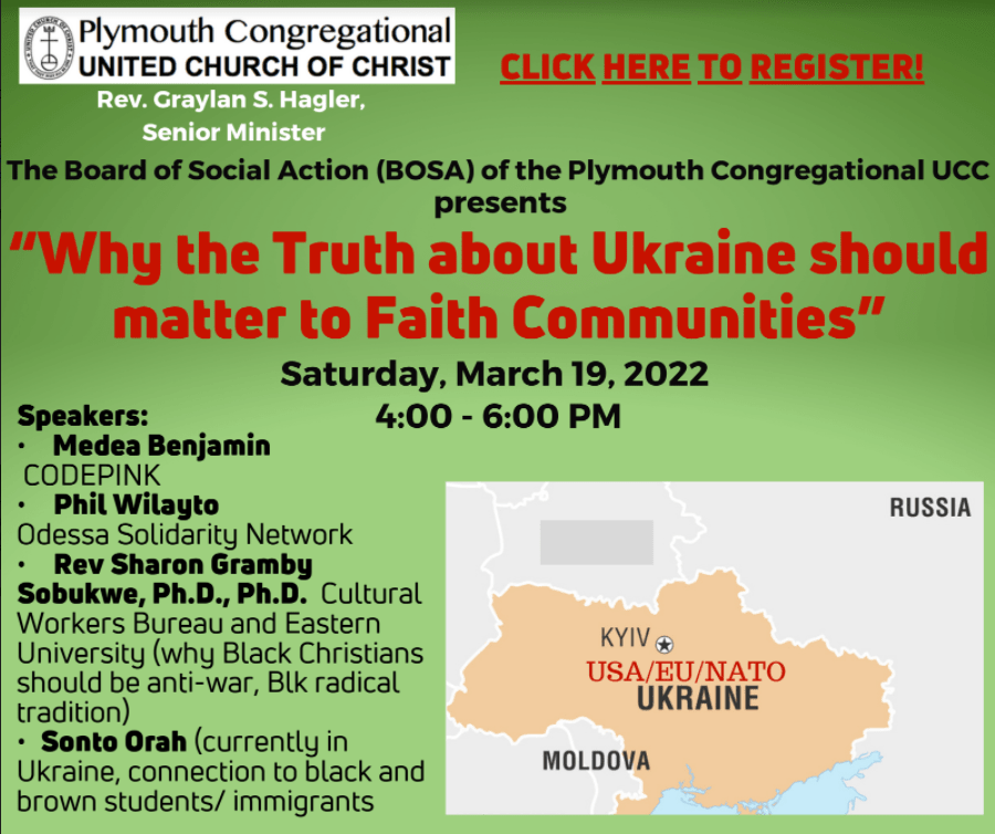 Saturday, March 19, at 4pm, the Board of Social Action of Washington, D.C.’s Plymouth Congregational United Church of Christ is holding a webinar on the Ukraine crisis featuring four speakers:
