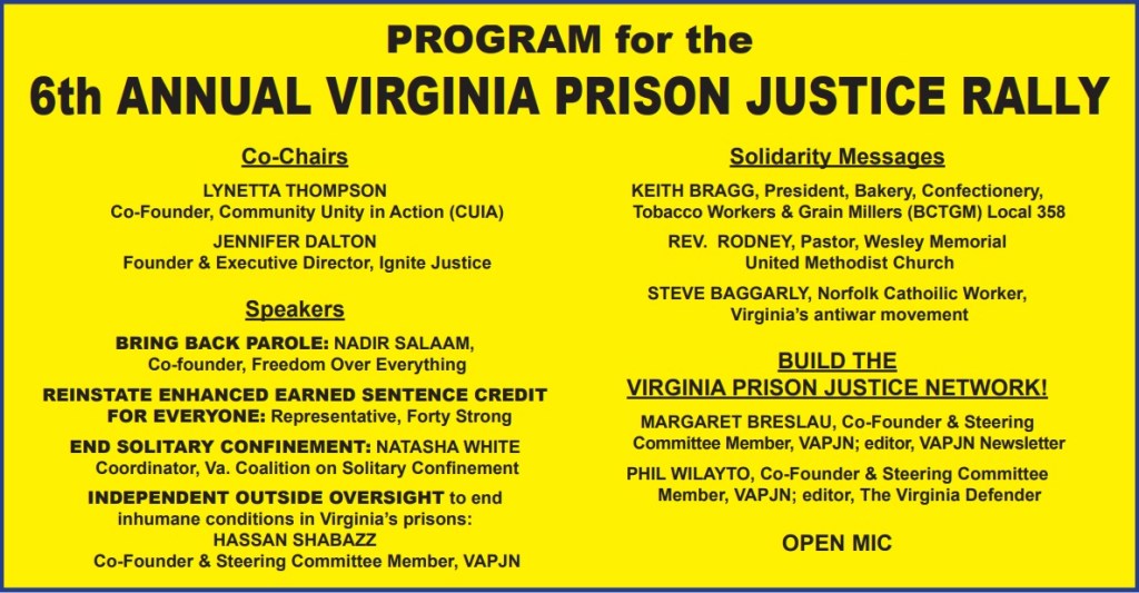 On Saturday, Jan. 14, the Virginia Prison Justice Network will hold its 6th Annual Virginia Prison Justice Rally, when prisoners, their families and supporters will raise issues that need to be addressed by the 2023 Virginia General Assembly. This edition of The Virginia Defender is dedicated to educating the public about those issues. And plan to join us at the rally!