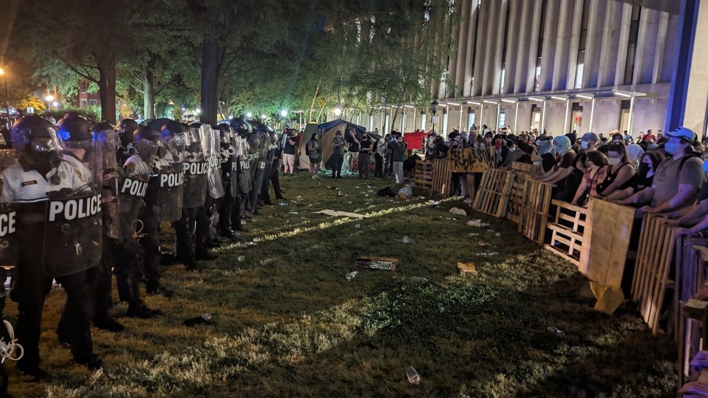RICHMOND, VA, April 29 — At about 8:30 this evening, Virginia Commonwealth University put out an alert that a “violent protest” was taking place on the campus of the state’s largest public university. There was violence, but it wasn’t from the protesters, who had set up a modest encampment on the lawn outside Cabell Library. No, the violence was from the VCU, Richmond and Virginia State Police, in full riot gear, who attacked a line of students chanting against the cops who were ransacking their encampment. READ MORE.