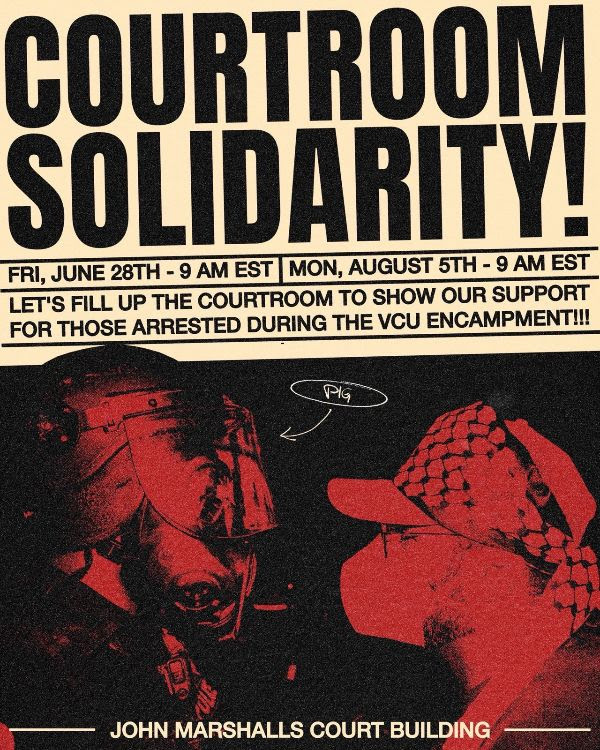 Some of the 13 people arrested at VCU April 29 when university, city and state police broke up a pro-Palestinian encampment will go on trial Friday, June 28, 9 am at the John Marshall Courts Building in downtown Richmond. We urge all supporters who can make it to attend the trial.
