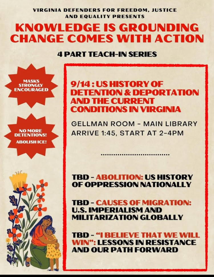 (1) U.S. history of detention & deportation & the current conditions in Virginia; (2) Abolition: U.S. history of oppression nationally; (3) Causes of migration: U.S. imperialism & militarization globally; (4) “I believe that we will win”: Lessons in resistance and our path forward.