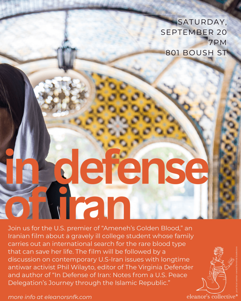 An Iranian film about a gravely ill college student whose family carries out an international search for the rare blood type that can save her life. The film will be followed by a discussion on contemporary U.S.-Iran issues with longtime antiwar activist Phil Wilayto, editor of The Virginia Defender and author of “In Defense of Iran: Notes from a U.S. Peace Delegation’s Journey through the Islamic Republic.” 7-9 pm at eleanor’s norfolk, 801 Boush St., Unit B, Norfolk. Copies of the book will be available for sale at the event. More information is available at the website for eleanor’s norfolk, here.