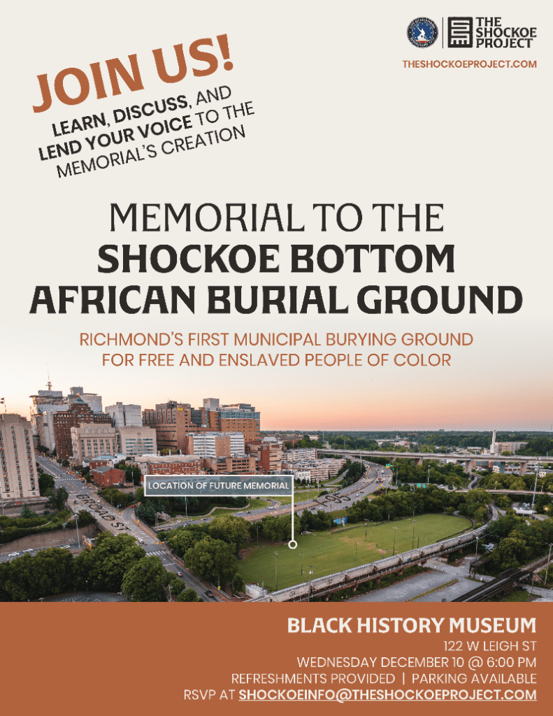 Wed., Dec. 10 – PUBLIC MEETING ON THE FUTURE OF SHOCKOE BOTTOM AFRICAN BURIAL GROUND MEMORIAL – The Shockoe Project will present an update to the Memorial for the African Burial Ground. Your input is critical! 6 pm at the Black History Museum & Cultural Center of Virginia, 122 W. Leigh St., Richmond. RSVP requested. Click here for flyer. For the background of the decades-long community struggle to reclaim and properly memorialize Shockoe Bottom, see the Sacred Ground Historical Reclamation Project.