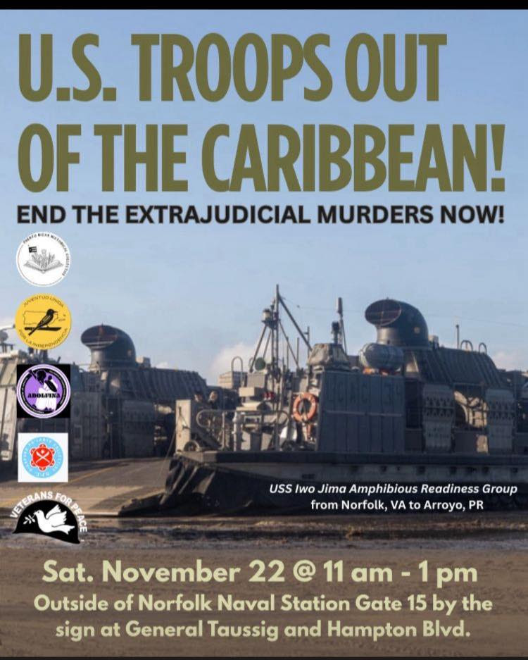 Sat., Nov. 22 – PROTEST: “U.S. TROOPS OUT OF THE CARIBBEAN! END THE EXTRAJUDICIAL MURDERS NOW!” – The U.S. has positioned a huge Naval force off the coast of Venezuela and is threatening war. Already, more than 20 small boats have been blown up and more than 80 people have been killed. The Trump administration claims, without offering any proof, that this is a war against drugs. In fact, it’s simply an attempt to bring down the government of Venezuela, the country with the world’s largest known oil reserves. That oil is owned by the government, which is attempting to use the profits to benefit the people, not U.S. oil companies. Many of the Navy ships threatening Venezuela are based in Norfolk, including the USS Gerald R. Ford, the world’s largest and most advanced aircraft carrier. Protests are being held around the country, but this one in Norfolk, sponsored by a wide range of organizations including the local chapter of Veterans for Peace, is especially significant. Join the Defenders in a car caravan to the protest. We leave from Richmond at 9 am and will be back sometime that afternoon. To sign up, email DefendersFJE@hotmail.com or call or text 804.644.5834.