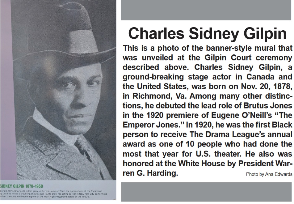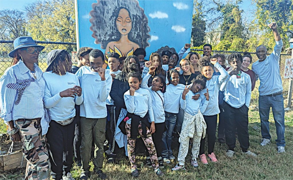 Members of the Charles S. Gilpin Community Farm Youth Conservation Corps gathered on Sunday, Nov. 16, to celebrate the unveiling of banner-style murals of Charles Gilpin, the world-renowned actor of the early 20th century for whom the Gilpin Court neighborhood is named. The event was organized by Community Unity in Action. At right is CUIA Co-chair Art Burton, a key organizer of the event. Photo by Ana Edwards.