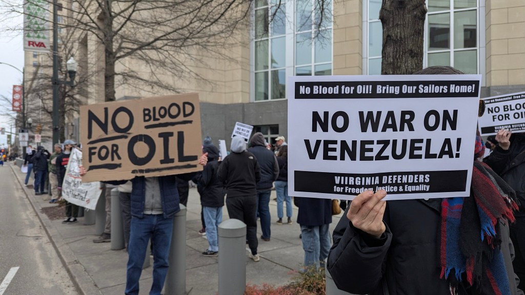 In Norfolk, protesters gathered outside Naval Station Norfolk, homeport to many of the U.S. Navy ships now operating off the coast of Venezuela. Other protests took place in Charlottesville and Roanoke.