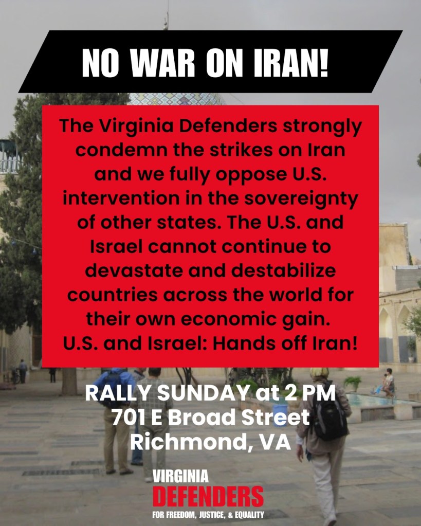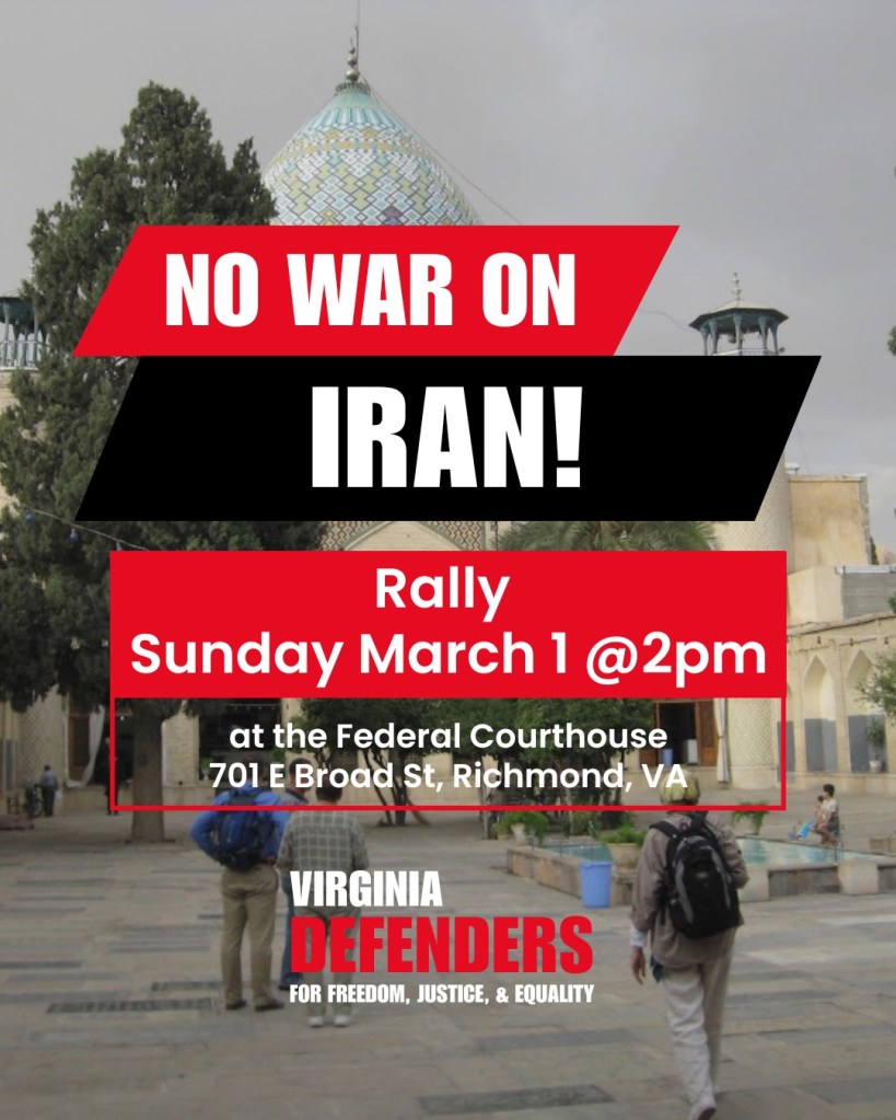 Uncategorized No War on Iran! Rally Sunday, March 1, 2026 By The Virginia Defender on February 28, 2026 • ( Leave a comment ) Share this: Share on X (Opens in new window) X Share on Facebook (Opens in new window) Facebook Like Loading... Related Categories: Uncategorized Tagged as: Iran